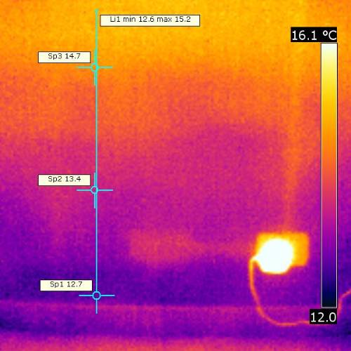 Questo metodo viene già largamente impiegato in edilizia per la valutazione dell’isolamento termico e offre alte prestazioni e notevole precisione nella diagnosi dell’umidità nella muratura a patto che si utilizzino termo camere di precisione (almeno 5-7 centesimi di grado) che hanno costi piuttosto elevati. Il sistema è però veloce e può offrire delle “fotografie” contenenti una mappatura della diffusione dell’umidità come si può osservare nelle fotografie sottostanti.